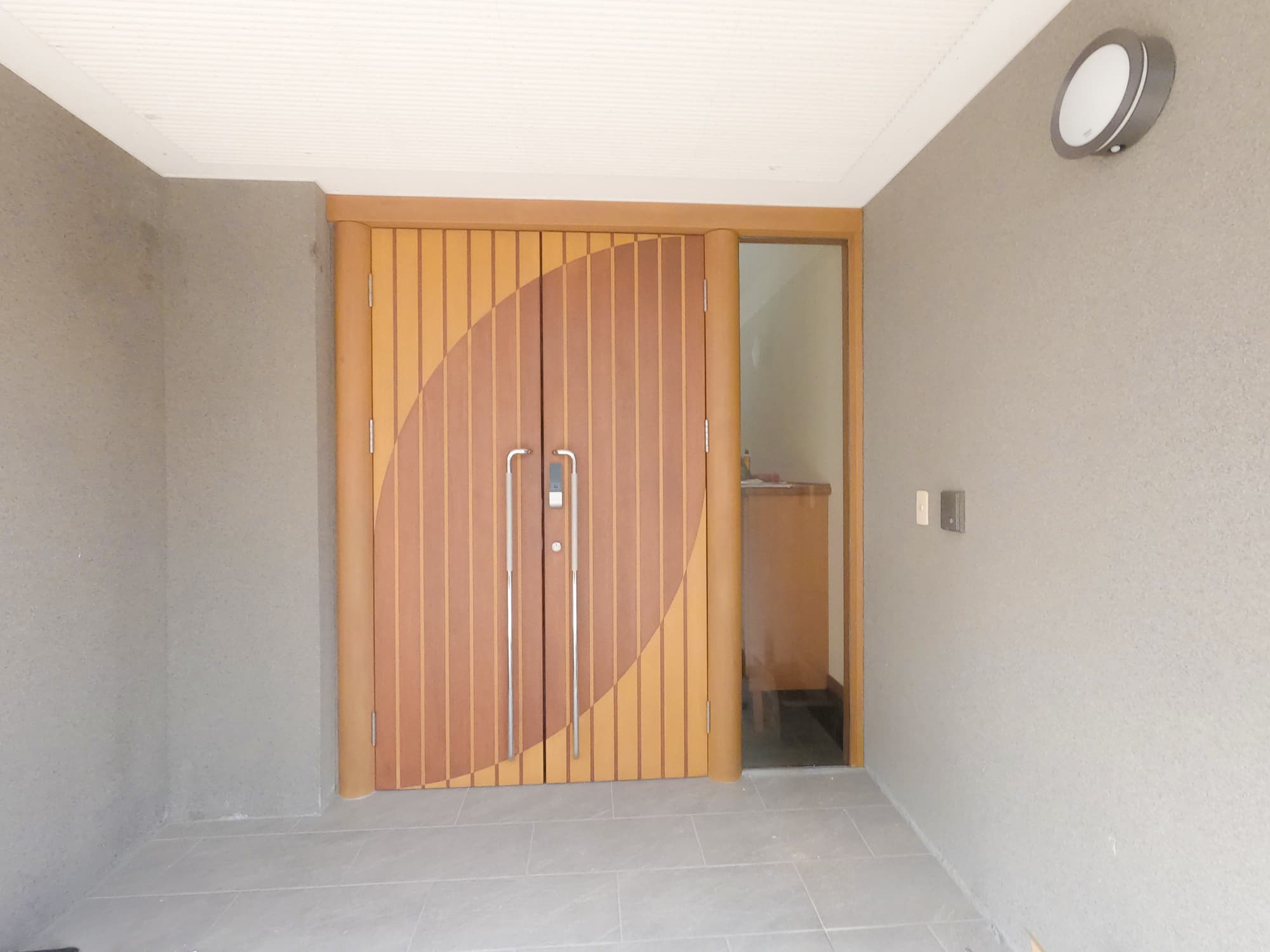 外装デザインに調和する玄関ドアとタイルを採用し、家の“顔”を一新しました。